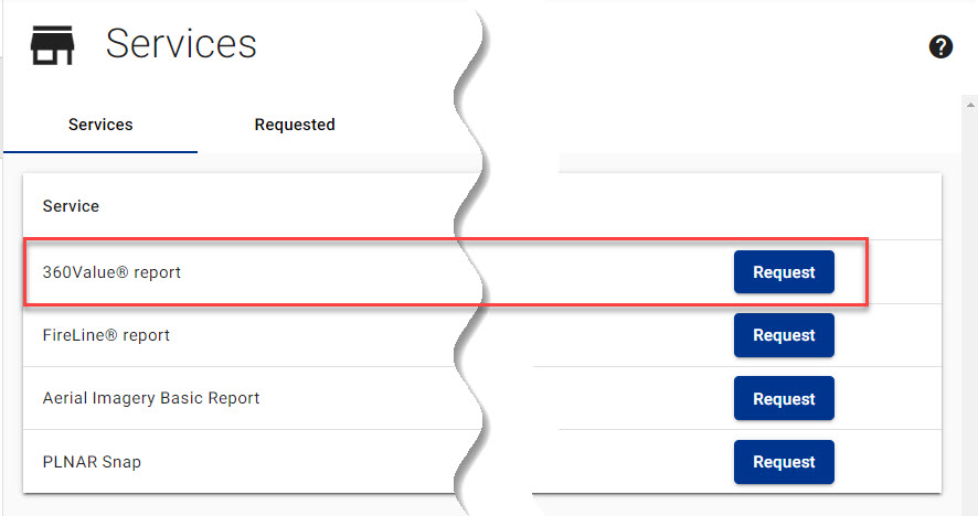 - Select Request. After the report is requested, the line for the 360Value report will display in both the Services and Requested tabs.